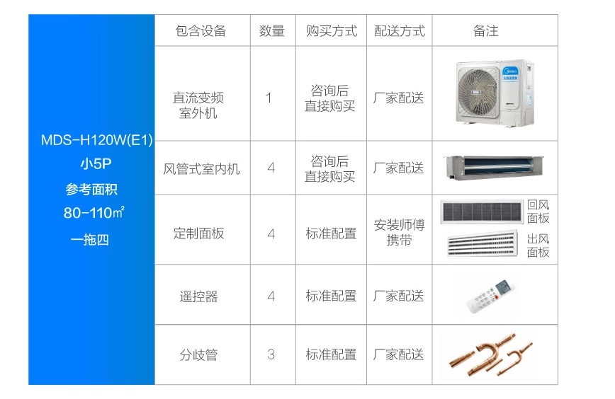 室外機(jī)安裝說(shuō)明書(shū)*1、室外機(jī)使用說(shuō)明書(shū)*1、室內(nèi)機(jī)使用說(shuō)明書(shū)*1、美的家庭中央空調(diào)安裝竣工報(bào)告書(shū)*1、出水管接管*1、網(wǎng)絡(luò)匹配線(xiàn)組*2、用戶(hù)服務(wù)指南*1、連接管(適用于16KW機(jī)型)、L型管(適用于10~14KW機(jī)型) |